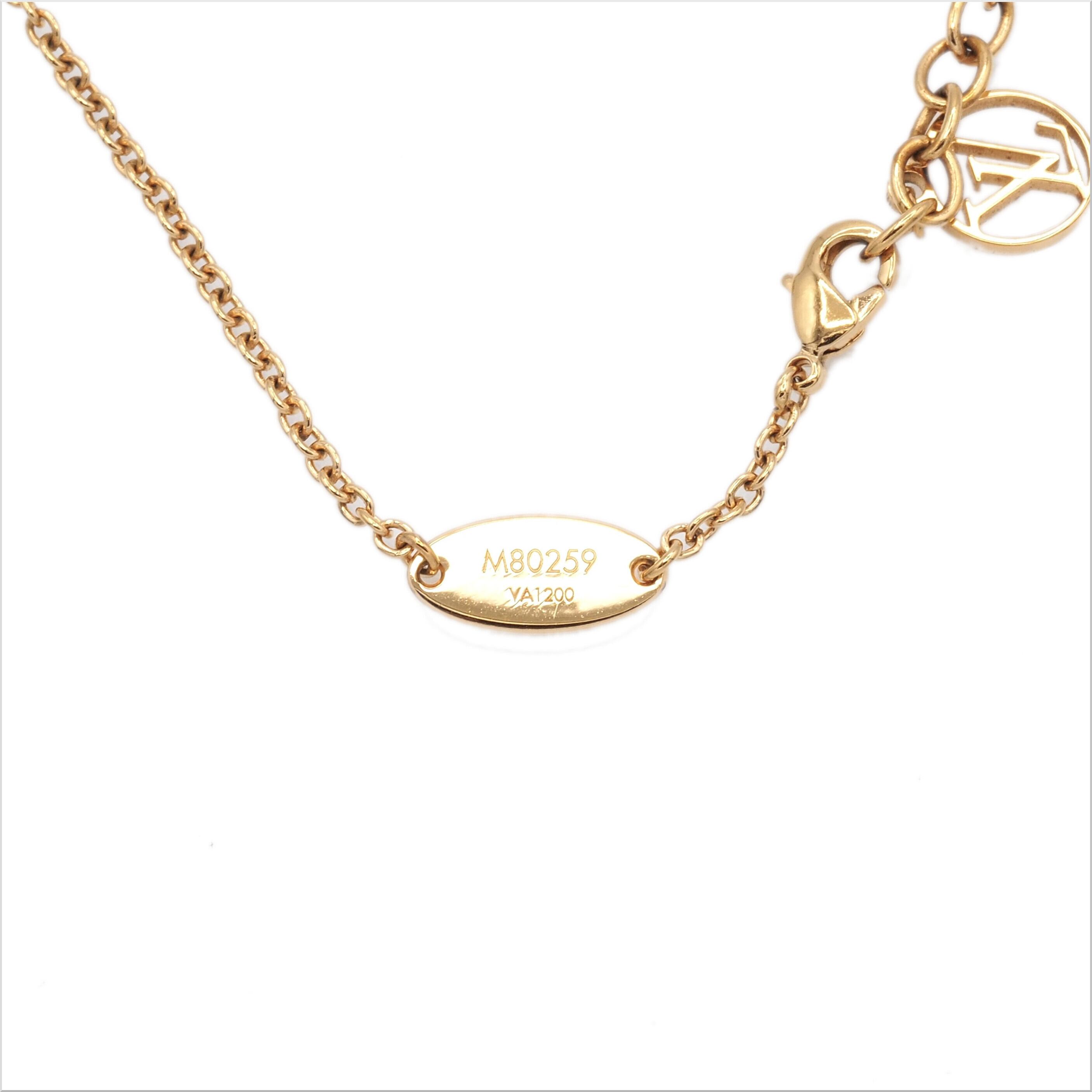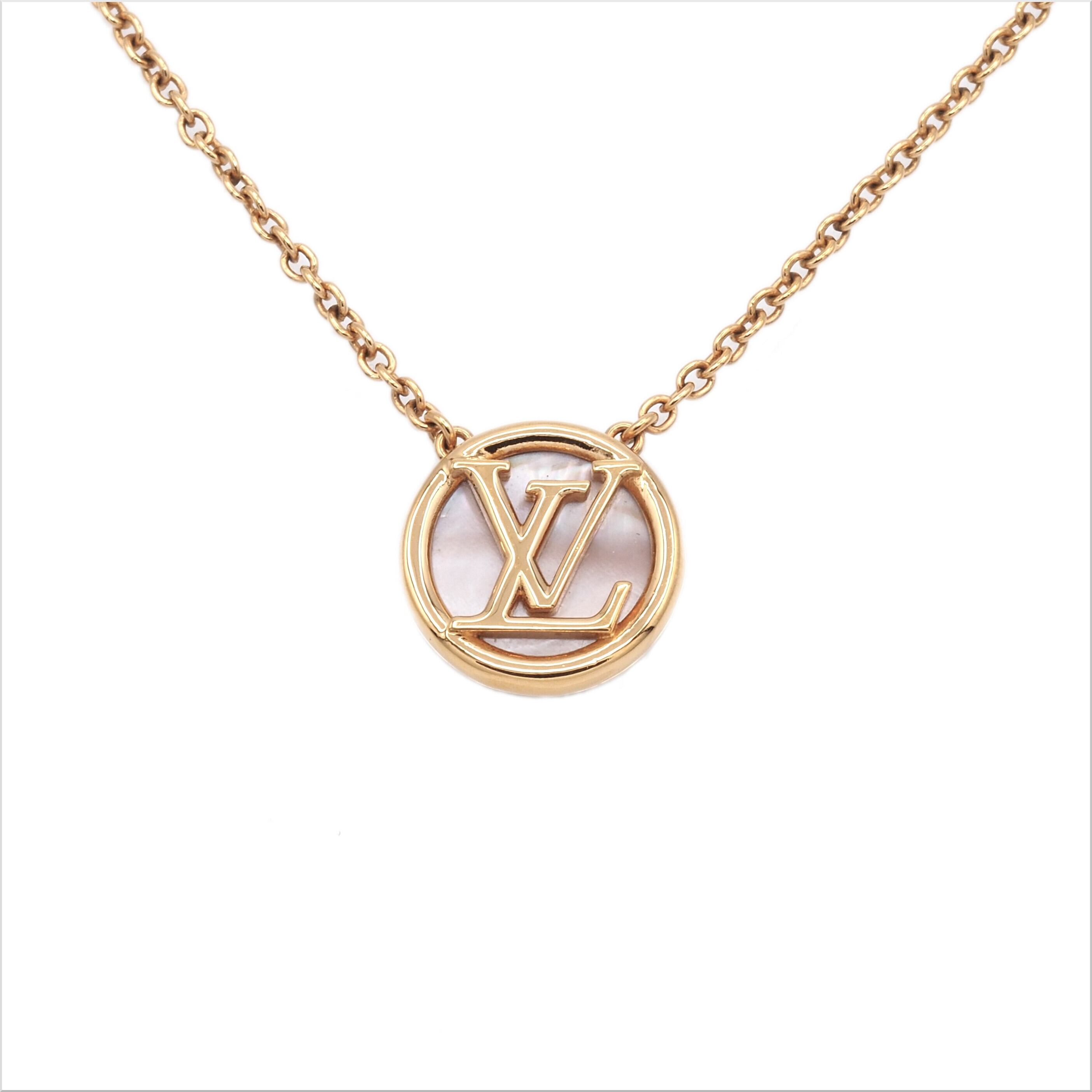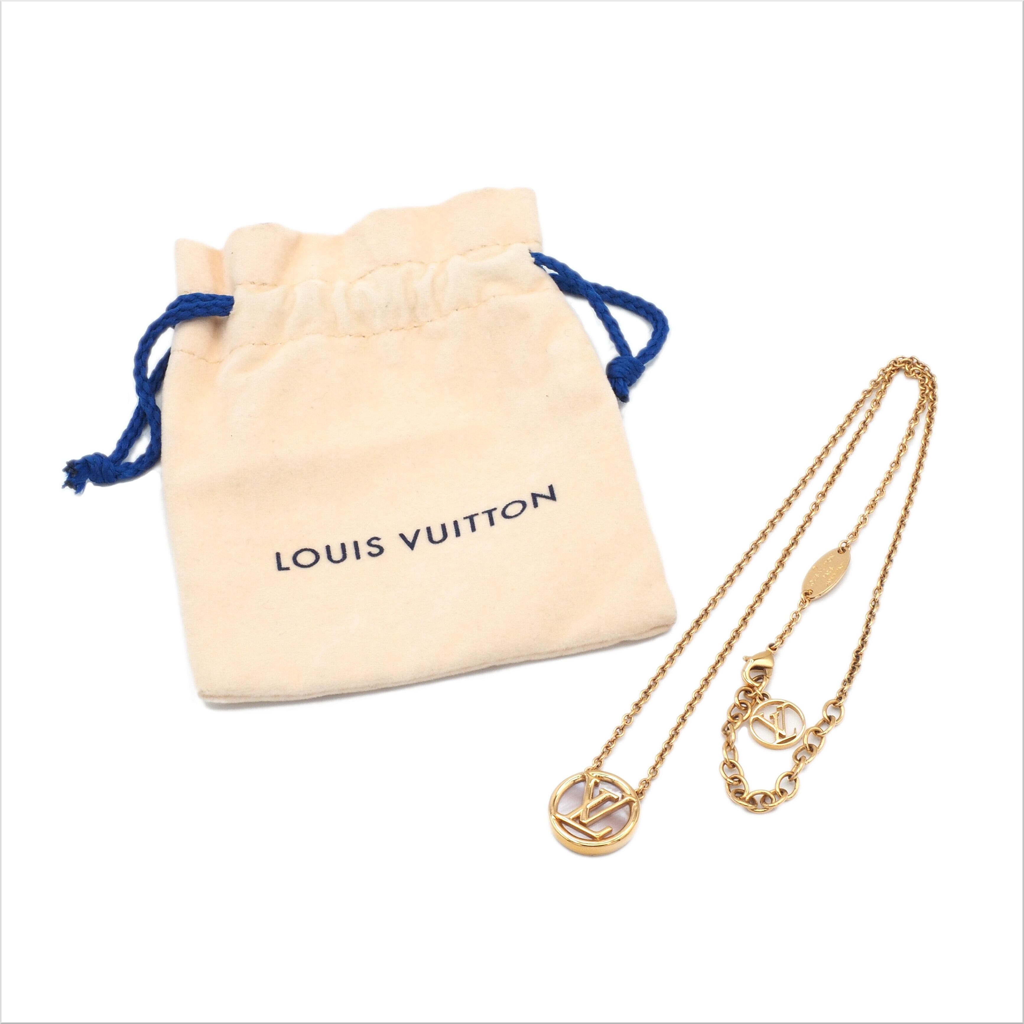ルイヴィトンのネックレス「コリエ L TO V」。マザーオブパールのやわらかな艶めきが、LVモチーフを上品に引き立てます。華やかなゴールドカラーのネックレスは、ラフな装いにもドレススタイルにも幅広くお使いいただけます。