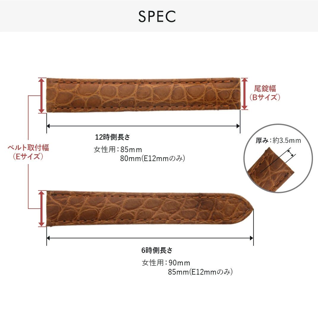 ※『時計ベルト取り付け幅(Eサイズ)』及び 『尾錠取り付け幅(Bサイズ)』につきましては、表示のサイズから約0.3mm~0.8mm程度広く作られています。取り付けられなかった際は無料でお取替えさせていただきますのでご安心ください。